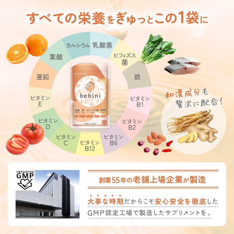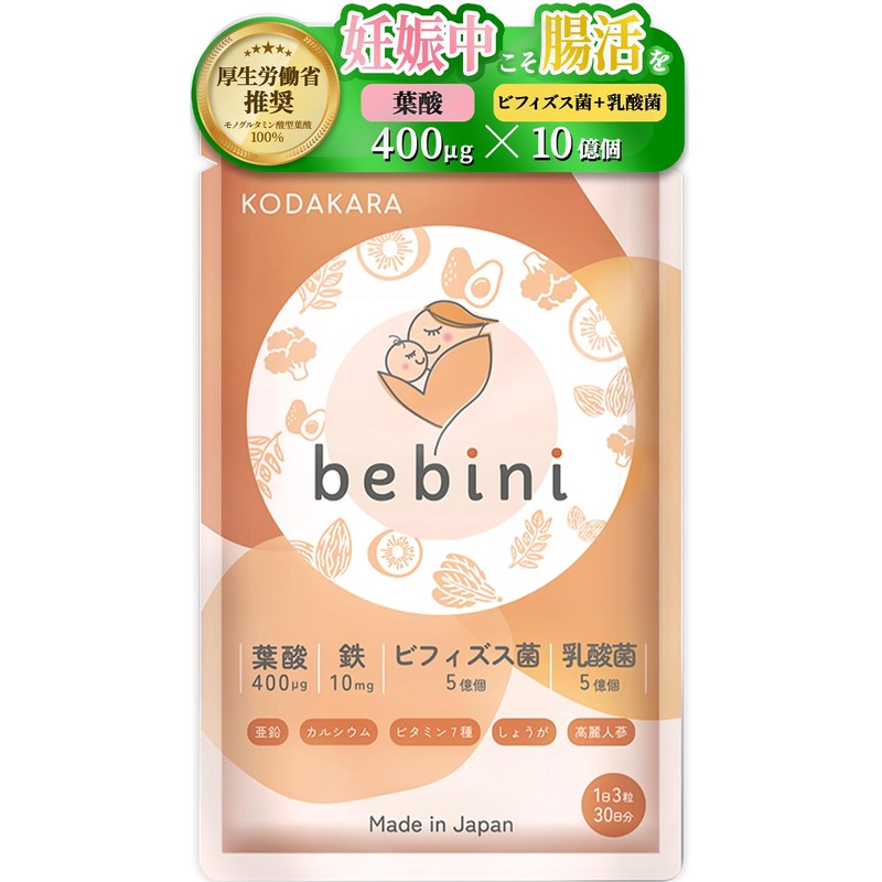 KODAKARA Bebini Folic Acid Supplement, 30 Day Supply, Folic Acid, 400 μg, Pregnancy, Pregnancy, Iron, Bifidobacteria, Lactobacillus Zinc, Calcium, 7 Vitamins, 2 Types of Japanese and Chinese