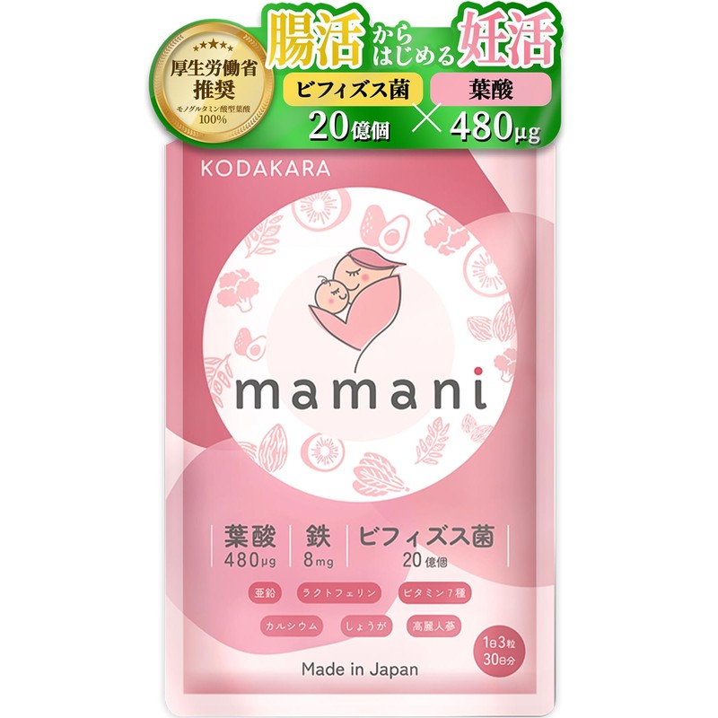 KODAKARA mamani 葉酸サプリ 30日分 葉酸 480μg 妊娠 妊活 妊婦 鉄 ビフィズス菌 亜鉛 カルシウム ラクトフェリン ビタミン7種 和漢成分2種 国内製造
