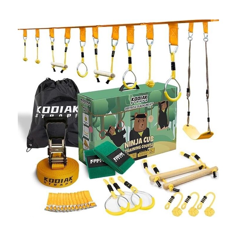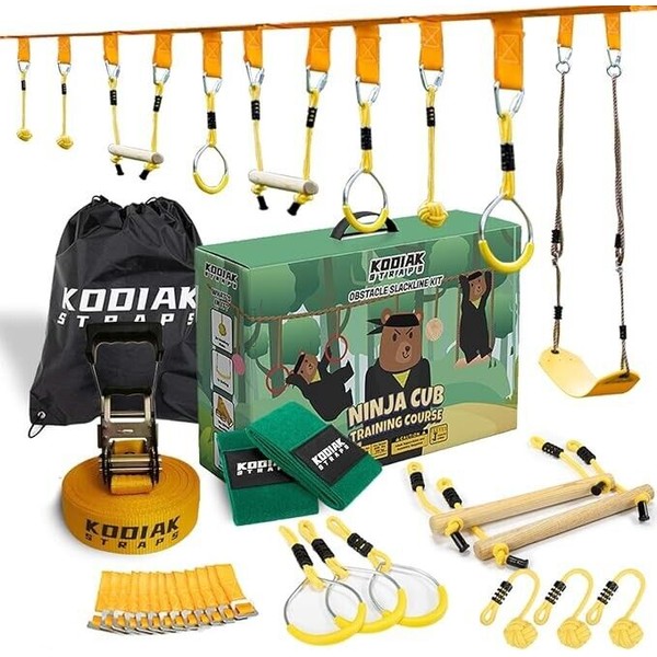 KODIAK STRAPS Ninja Warrior Monkey Bar Kit 50FT Kids Slackline Obstacle Course w/ 1 Tree Swing