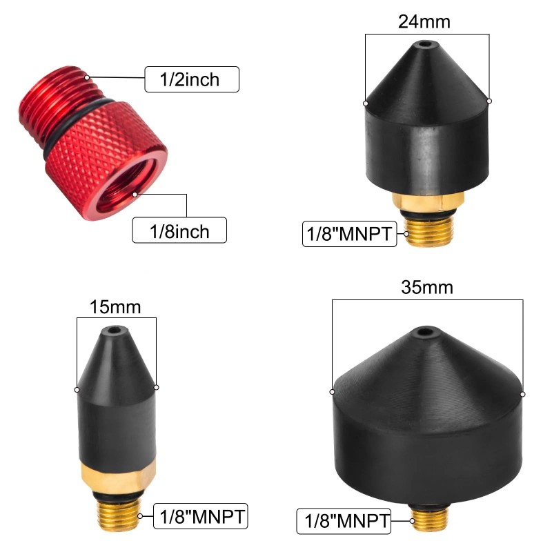 【Size】3pcs rubber nozzles are 15mm,24mm,35mm respectively and the fittings are all 1/8"MNPT. And the brass fittings on the ends ensure tight connection and longer lifetime.