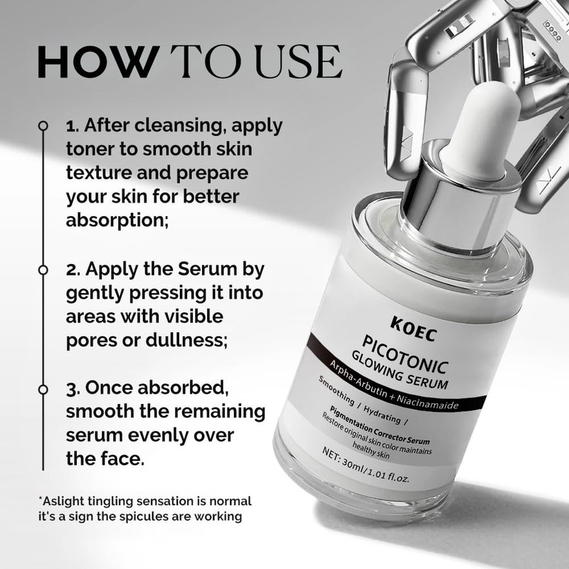 • 【Targeted Clarifying Complex】Picotonic shot ampoule enriched with ARBUTIN,the formulation works diligently to reduce the appearance of hyperpigmentation and uneven tone,promoting a more uniform and naturally luminous skin surface.