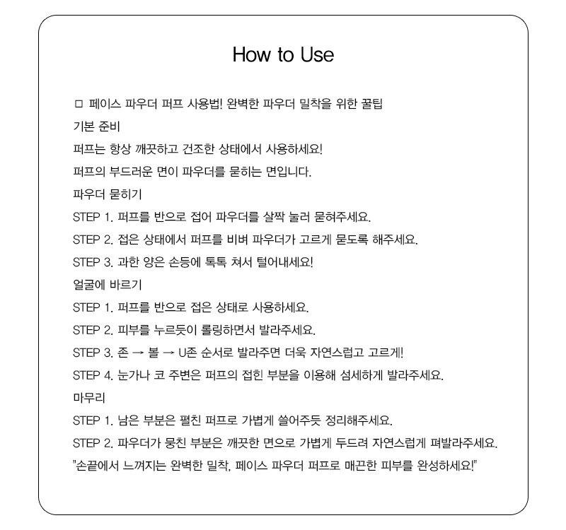 - How to Use: Place an appropriate amount on the puff, then fold the puff in half and rub it to distribute the powder evenly. For broad areas like the forehead and cheeks, apply by patting with the full surface of the puff. For narrow areas like the sides of the nose, apply by folding the puff and pressing firmly.