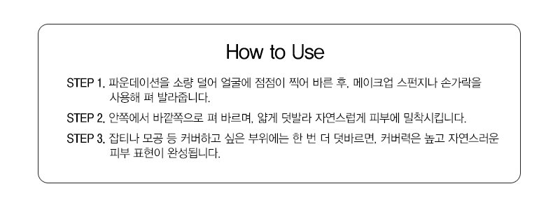 - how to use: Apply a small amount to the face by dabbing, then spread from the inside out using a makeup sponge. Dab a small amount onto the sponge again and apply from the outside inward to smoothly cover pores and wrinkles. To enhance adhesion, use the broad side of the sponge to lightly tap, which will revive shine and increase coverage.
