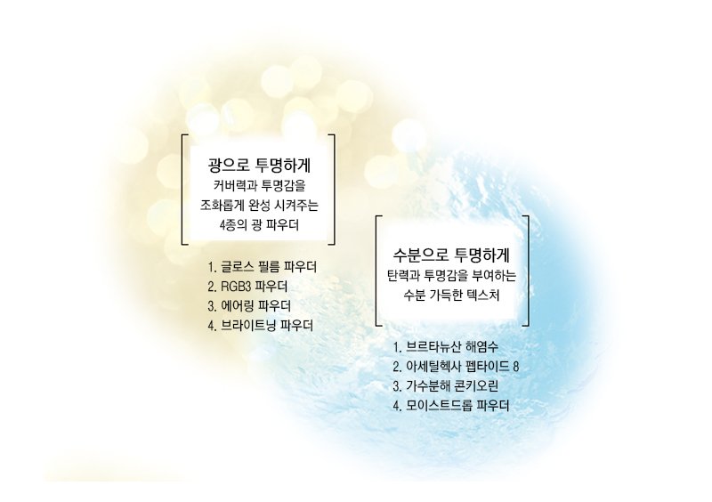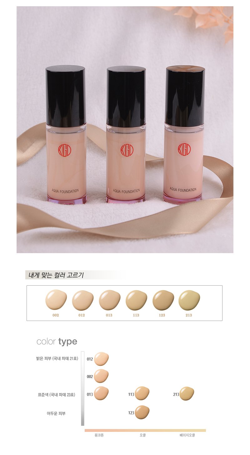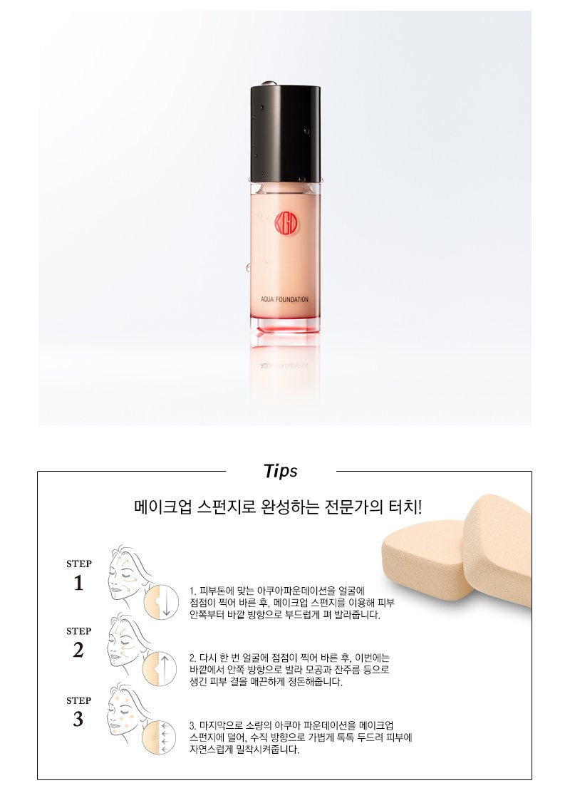 촉촉하고 투명한 피부 연출 ‘RGB(빛의 3원색)’ 파우더가 피부 위에 빛의 막을 형성해 자연스러운 촉촉함과 맑고 투명한 피부 톤을 완성해 줍니다. 피부에 자연스러운 윤기와 수분을 더하는 코겐도 아쿠아 파운데이션은 밀착력과 지속력을 강화하는 글로스 필름 파우더를 배합하여 하루 종일 빛나는 피부를 유지해 줍니다. 프랑스 브르타뉴 해염수와 에이징 케어 성분이 메이크업을 하는 동안 피부에 촉촉한 수분을 공급해, 편안함과 동시에 생기 있는 피부로 가꿔줍니다. 또한, 황금 비율의 'RGB 파우더(빛의 3원색)'가 피부 위에 부드러운 빛의 막을 형성해 자연스럽고 맑은 피부 톤을 연출해 줍니다. 맑고 투명한 피부를 위한 특별한 선택, 코겐도 아쿠아 파운데이션을 지금 경험해 보세요.