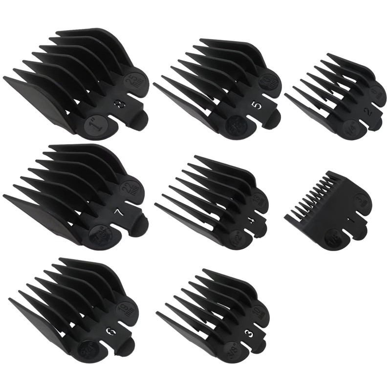 5. The universal clipper comb set includes 8 sizes: 1/8”, 1/4”, 3/8”, 1/2”, 5/8”, 3/4”, 7/8” and 1". Can meet your requirements for creating various hairstyles.