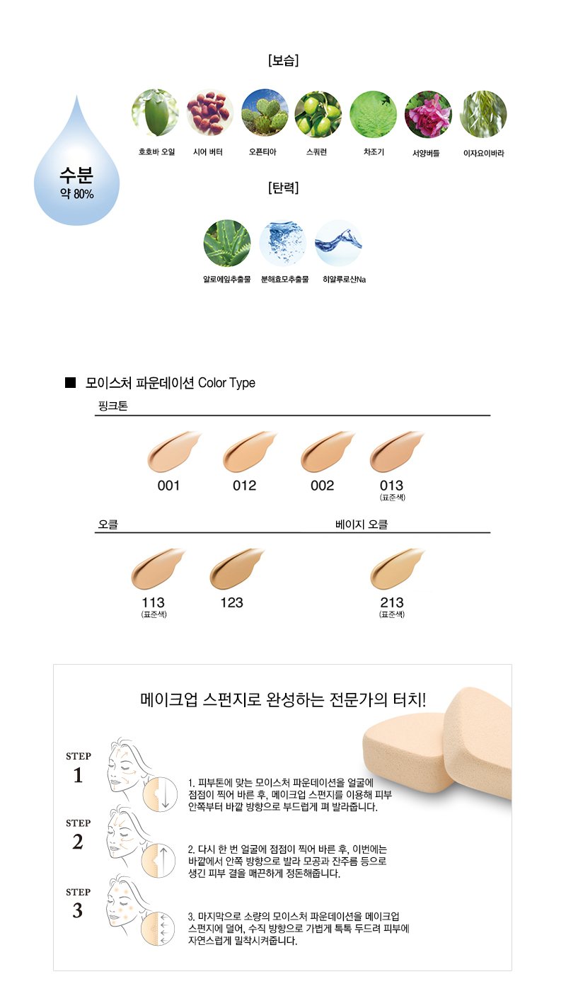 정성스럽게 제작된 모이스처 파운데이션은 오일 속 작은 물방울이