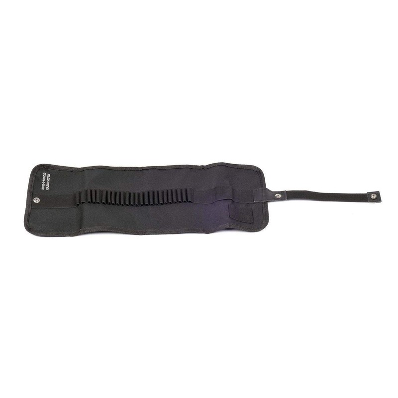 - A textile rolling pen case for 24 coloured pencils depending on choice of the customer. There is a loop for an eraser and a small pocket for a sharpener. The pencil case has black colour. The loops for the coloured pencils and the eraser, and the pocket for the sharpener are made from textile rubber. After rolling, the pencil case is closed with a press stud on the textile rubber.