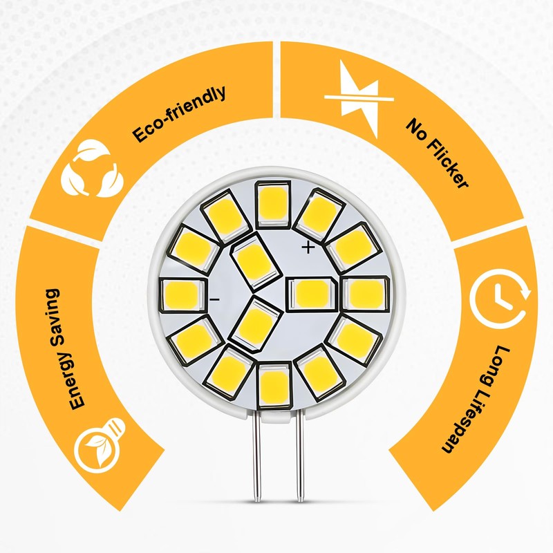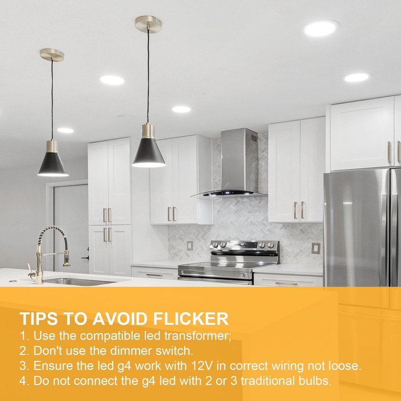 - Kein Flackern: Mit 15 leistungsstarken SMDs und einem hohen CRI von 80Ra bietet diese G4 LED birne ein helles, gleichm??igen und sofortigen effekt, kein flimmern, kann Ihr auge schtzen. Tipps: 1. Verwenden Sie den kompatiblen Transformator. 2. Benutzen Sie nicht den Dimmschalter. 3. Stellen Sie sicher, dass die LED G4 mit 12 V funktioniert und die Verkabelung korrekt ist und nicht locker ist. 4. Schlie?en Sie die G4 stiftsockellampe led nicht mit 2 oder 3 herk?mmlichen Glhbirnen in derselben Verkabelung an, da diese m?glicherweise den gesamten Strom verbrauchen und zum Flackern der G4-Leuchten fhren k?nnen.