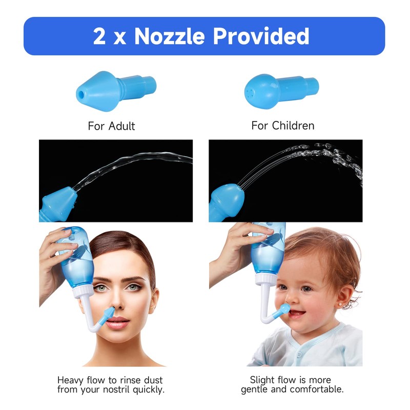 - Fit for EveryoneOur 2 different attachments guarantee a pleasant rinse - regardless of the size of the nose: ideal design for adults or children.Children should be used under the supervision and guidance of a doctor or adult.