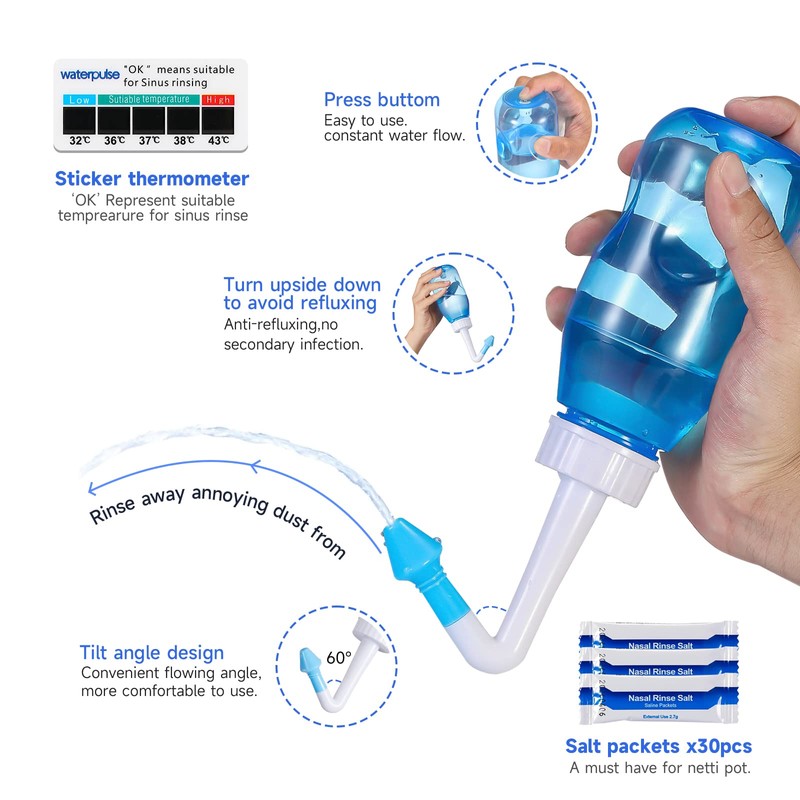 - Easy to Use: The unique structure and patented button allow perfect transparent water flow, so it is easy to see the water level. Through nasal irrigation, you can quickly remove the dirt from your nose in your daily life. The doctor recommends using water at a temperature of 37 c/98.6 F.