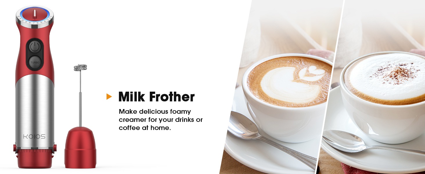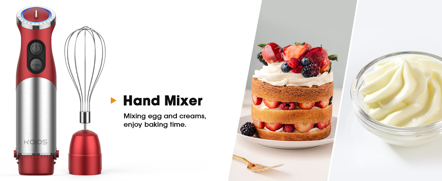 - 5 IN 1 Hand Blender – Our immersion blender handheld set Includes hand blender, egg whisk, 600ml(24oz) Beaker,500ml(17oz) food chopper bowl and milk frother.Choose KOIOS blenders for kitchen is great assistant for food lovers.