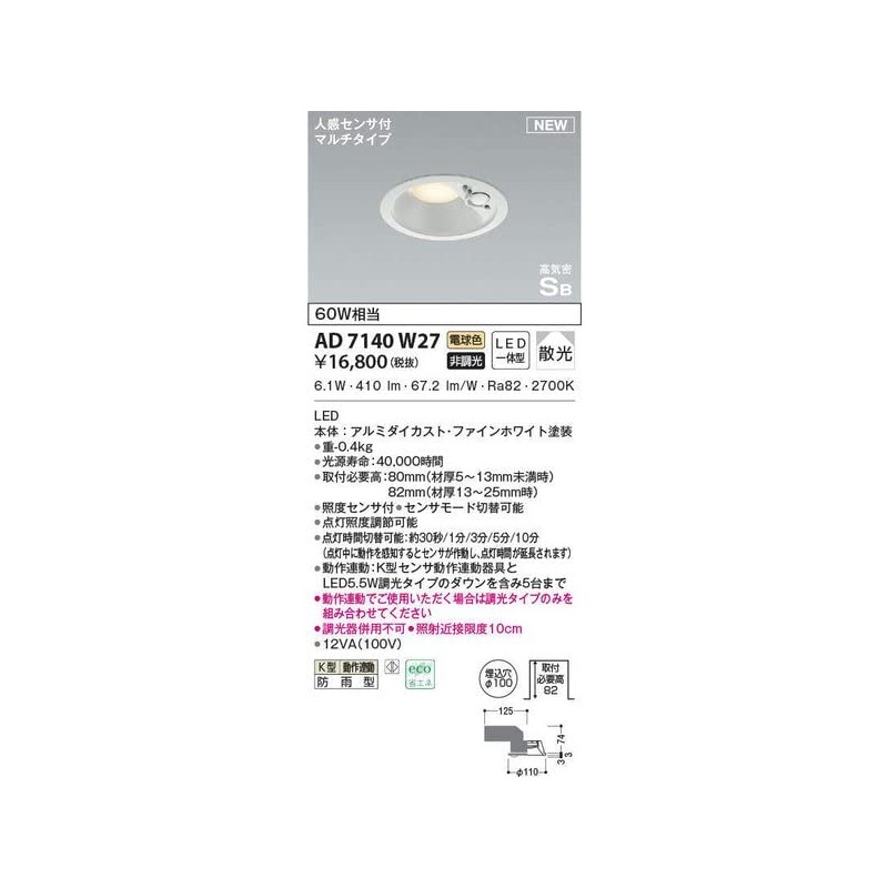 Koizumi Lighting AD7140W27 LED (Bulb Color) Downlight, Equivalent to 60W