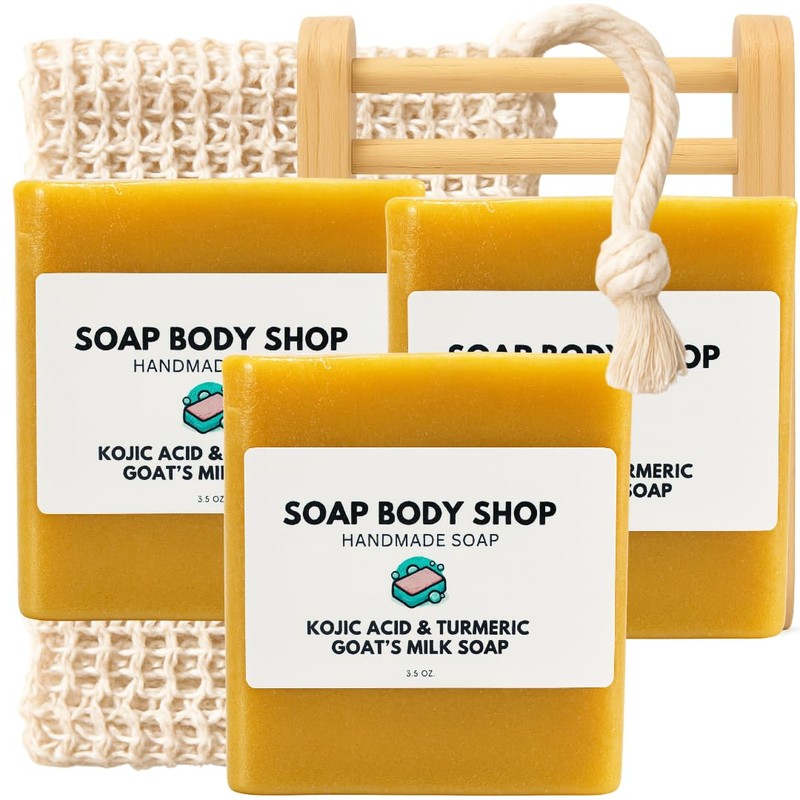 Kojic Acid & Goat’s Milk Turmeric Face & Body Soap Bar with Soap Saver & Wooden Tray – Unscented Handmade Natural Soap with Coconut Oil & Grapeseed Oil – Helps Fade Dark Spots & Uneven Skin Tone, 3.5 oz