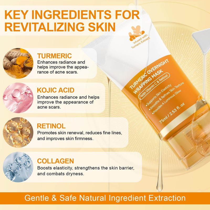 - Powerful Brightening Overnight Mask: Infused with Kojic Acid and Turmeric, this peel-off overnight mask helps visibly brighten dark spots and uneven skin tone while you sleep—leaving your complexion radiant and refreshed by morning.