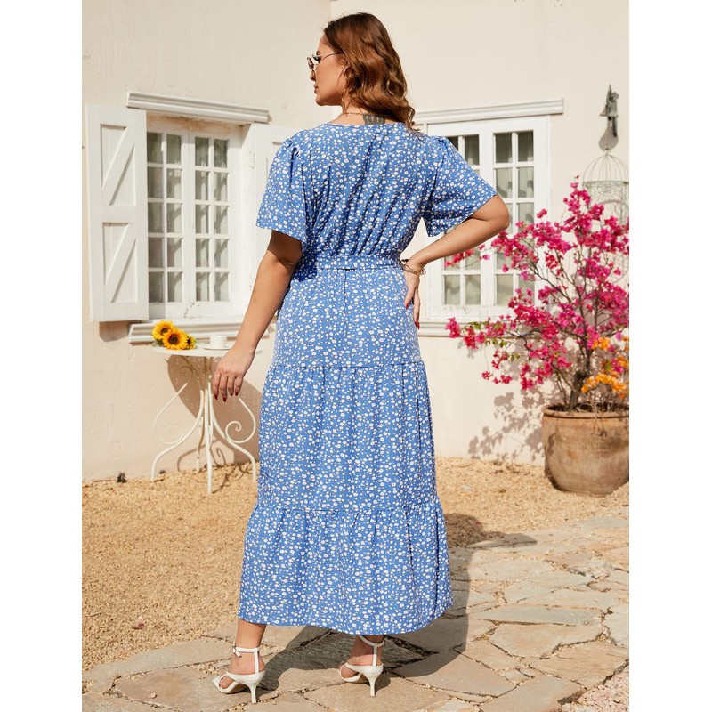 KOJOOIN Women Plus Size V Neck Wrap Maxi Dress High Waist Ruffle Summer Casual Dress with Belt Short Sleeve Blue Flower 4XL