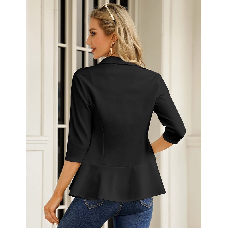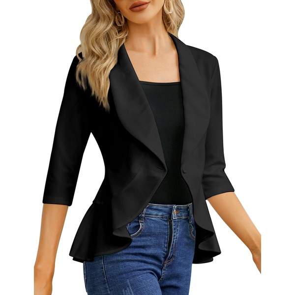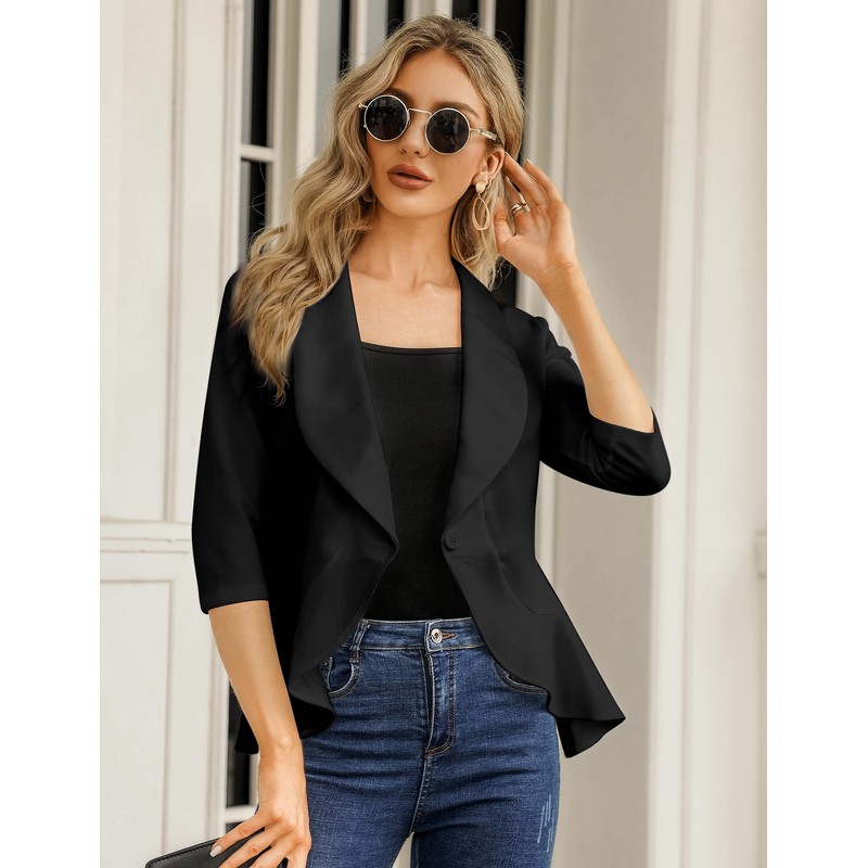 - FEATURES: 3/4 sleeve office blazer jacket, basic shawl collar, black blazer for women, open front with a single front button, ruffle hem, slim fit jacket suit, solid color/plain, no liner or shoulder pads.