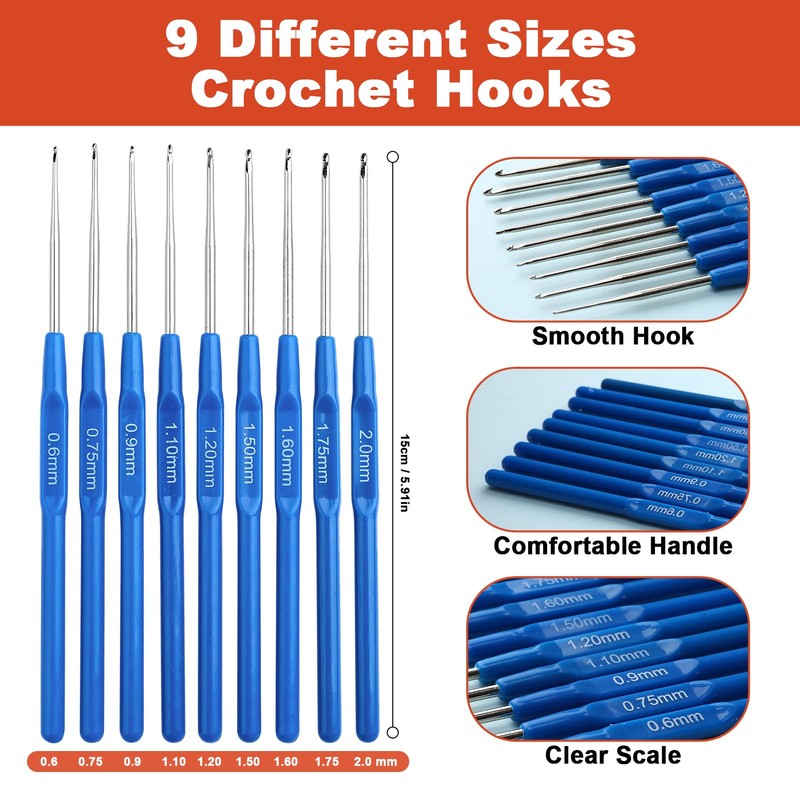 - All in one storage case bag:9 pcs ergonomic crochet hooks(2.0 /2.5/3.0/3.5/4.0/4.5/5.0/5.5/6.0mm).4 pcs aluminum crochet hooks(7.0/8.0/9.0/10.0mm).8 pcs lace crochet hooks (0.6/0.75/0.9/1.1/1.2/1.5/1.6/1.75 mm).20pcs stitch markers and stitch holders.9 pcs yarn needles.4 pcs curved needles.2 pcs Aluminum pins.2 pcs needles threader.3 pcs cable stitch holders.6 pcs sewing needles.Tape Measures,needle gauge sewing ruler.