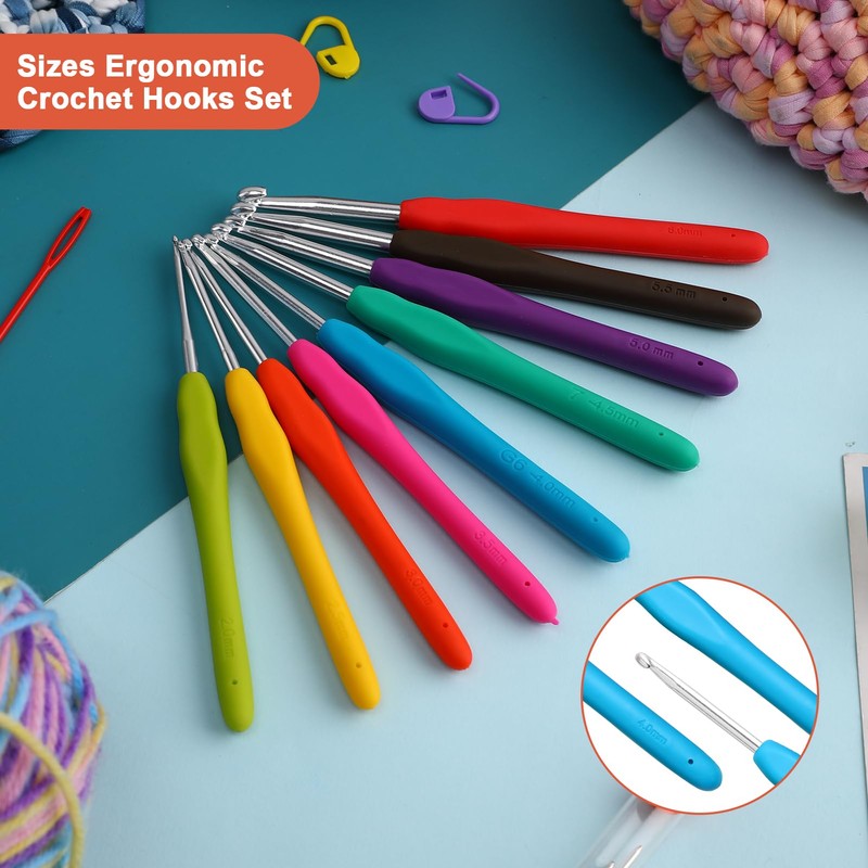 - Add extra enjoyment to your crocheting with these comfortable hooks that allow the yarn to slide effortlessly while you stitch. Each vibrantly-colored elastomer rubber handle is color-coded for easy identification of size.