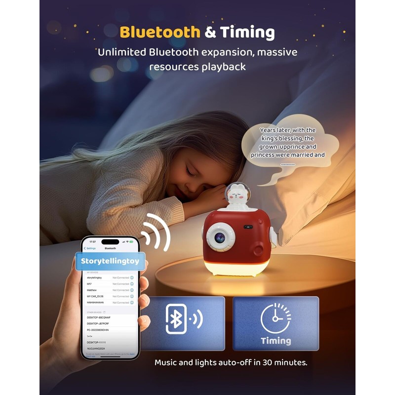 - BEDTIME STORYTELLER TIME: Both little girls and boys like to fall asleep listening to stories. This storybook projector gift satisfies their bedtime wishes. A story every day before going to bed, let your child enter a sweet dreamland. It can also be used as night light lamps to help overcome childrens fear of darkness. The product adds Bluetooth function, which can connect the mobile phone, listen to children's radio and social radio, and can also be used as a Bluetooth small speaker.