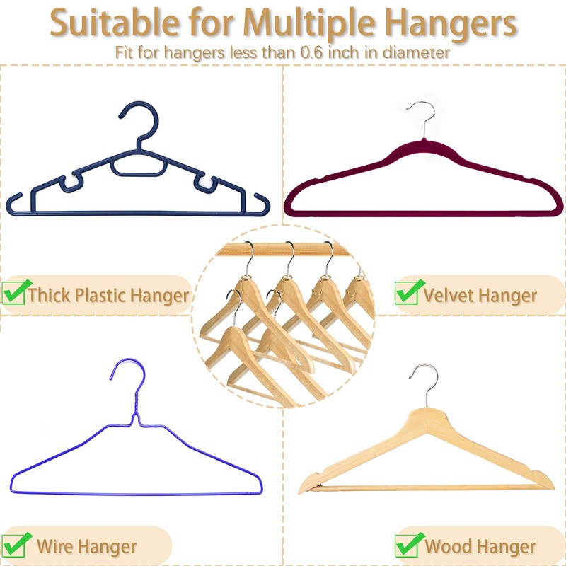 - Versatile: Our clothes hanger hooks are not only suitable for hanging on various hangers such as wooden hangers, wire hangers, stainless steel hangers, velvet hangers, plastic hangers or other hangers but also can meet needs of hanging different items like shirts, pants, hats, bags, neckties, leather belt and other accessories.