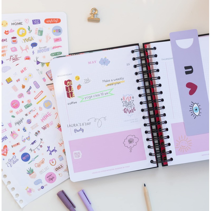 - 2022 Diary Day Per Page - Includes 2 pages full of stickers to customize this cute daily planner. Comes with space for schedules, a calendar with yearly view, personal data, public holidays info, birthdays, goals, budget management section, exercise routines and 6 pages for notes. It also includes a section to write down thing to buy, read, watch, cook and DIY. Ideal as a teacher planner, academic diary 2022 or weekly planner