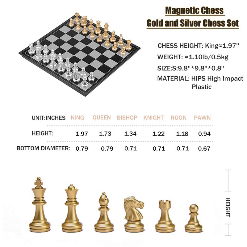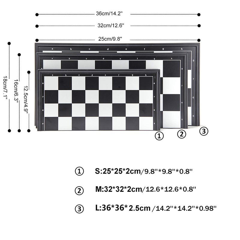 Size:Board measures S:9.8"L x 9.8"W x 0.8"H (25cm x 25cm x 2cm) when open, King measures 1.9"H x 0.8"W (5cm x 2cm),and only 4.92"L x 9.84"W x1.56"H(12.5cmx25cmx4cm) when folded.