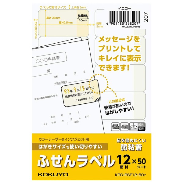 Kokuyo KPC-PSF12-50Y Labels, Postcard Size, Easy to Use, Sticky Labels, 12 Sides, 50 Sheets, Yellow