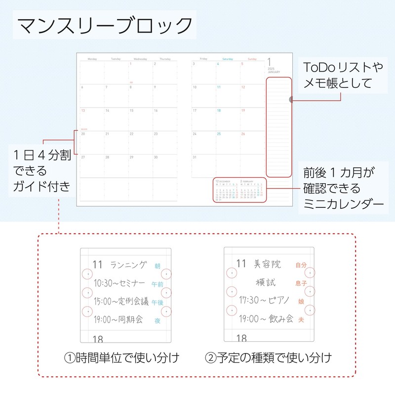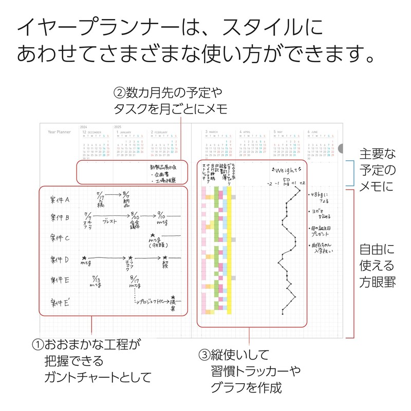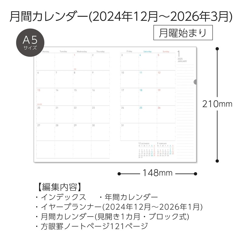 - (Editing Contents) Indexes, annual calendar, ear planner, monthly calendar (1 month opening, blocked), 60 ruled notebook pages (121 pages)