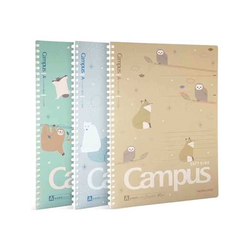 KOKUYO Spiral Notebook Journal, 3 Pack Campus B5 Soft Ring Notebooks with Dotted A 7mm Rule, 40 Sheets, Cute Animal 1 Subject Notebook in Blue Yellow Green, College Office Note Taking. Japan Import