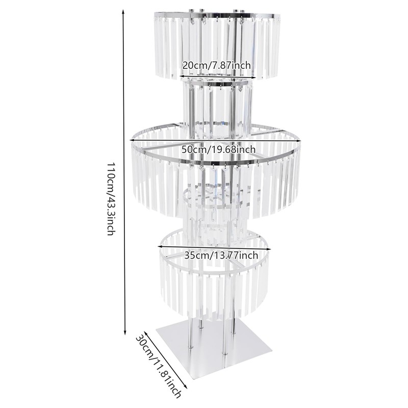 <p>Application</p><p>It can be used together with flowers, artificial flowers, candles, and other decorations (all excluded) for weddings, parties, and special occasions as well as other event reception venues.</p><p><br></p><p>Specification</p><p>Color: Clear, Silver</p><p>Mount Type: Desktop, Floorstanding</p><p>Assembly Required: Yes </p><p>Number of Tiers: 5</p><p>Material: Iron, Acrylic</p><p>Process: Electroplating</p><p>Base Size: 30*30cm/11.81*11.81in</p><p>Round Flower Holder Diameter: 20cm/7.87in, 50cm/19.68in, 35cm/13.77in</p><p>Total Product Height: 110cm/43.3in</p><p>Package Size: 52*52*9cm/20.47*20.47*3.54in</p><p>Gross Weight: 6.50kg/14.33lbs</p><p>Net Weight: 6.18kg/13.62lbs</p><p><br></p><p>Notes </p><p>1. Please check the style and size before purchasing.</p><p>2. Please follow the diagram for installation.</p><p>3. Please note that this product does not include decorative items such as bouquets.</p><p>4. Please allow the slight color difference caused by the shooting light and 1-3cm error due to manual measurement and make sure you do not mind before ordering.</p>