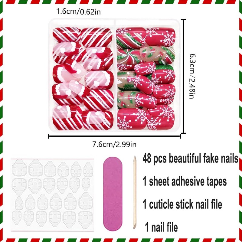 - 【What's included?】2 Packs Christmas hat snowflake cherry stripe glitter designed press on nails, 1 nail file and 1 adhesive tabs nail glue, 12 nail sizes ensure a totally fit, 24 pieces each, Total 48 pieces. Suitable for Christmas party decoration to create a winter Xmas atmosphere. you will more charming and gorgeous when wearing New Years nail accessory.