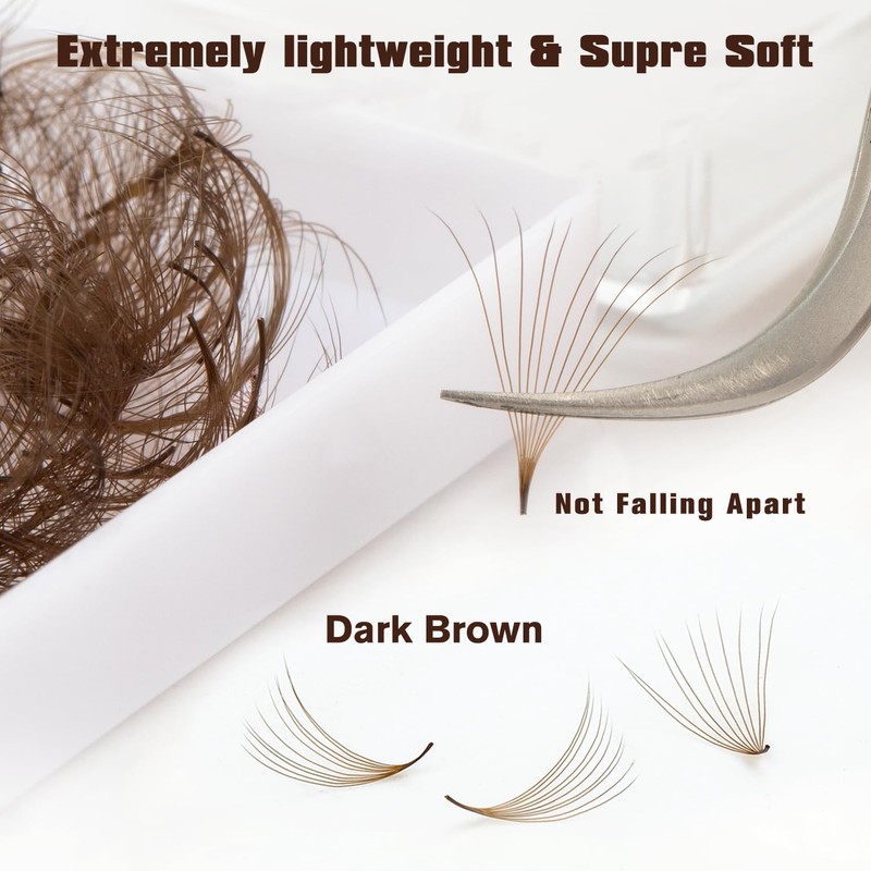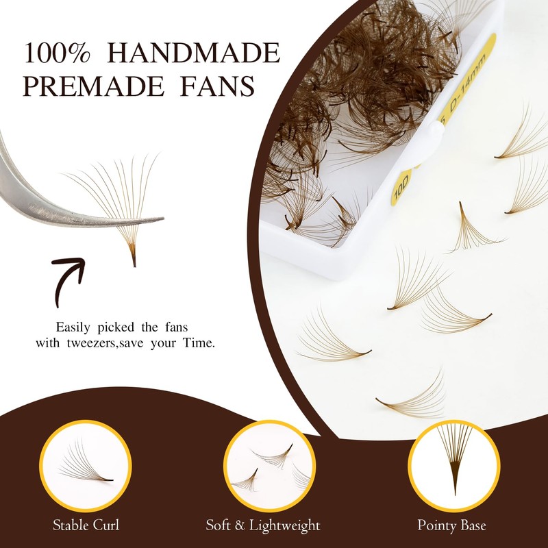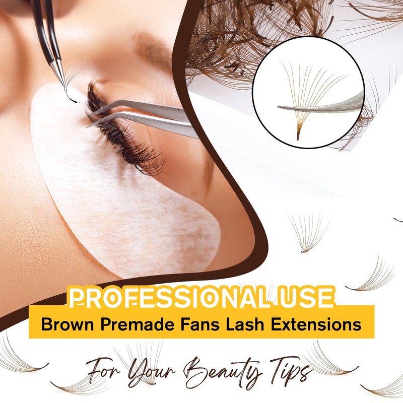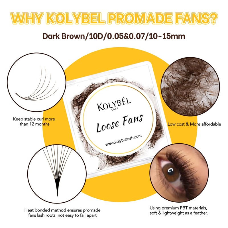 • COST EFFECTIVENESSKolybel Promade Fans Lash Extensions 500 fans/ box,10-15mm Single Length.Brown Premade fans eyelash extensions mixed tray are more affordable and durable. Meet your needs in length, curl and thickness, and help you save money and time on choosing eyelashes.
