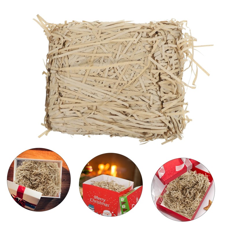 christmas boxes Used this to fill some kraft paper boxes, it went very well with that and looks nice.kraft Comes with a nice light color, it quickly adds some elegance to and packaging.faux This is a great product that goes a long way.crinkle cut fill It is a nice alternative to tissue paper for filling up spaces in a decorative way