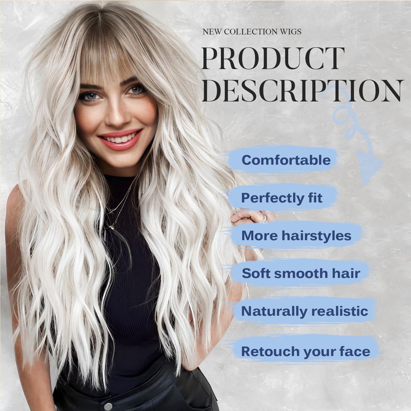 KOME Ombre Platinum Blonde Wigs with Bangs,White Long Wavy Wig for Women,Long Curly Wigs Synthetic Hair Dark Roots Wig for Party Cosplay Daily Use 24IN