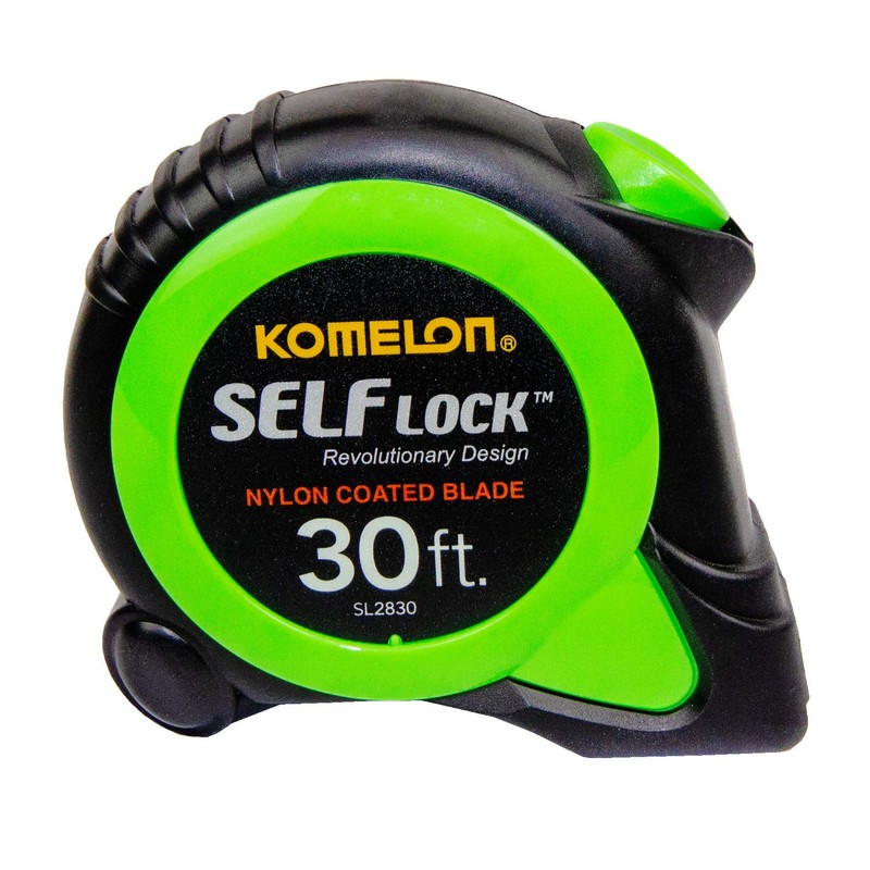 The 30-foot self Lock has a 1-inch Nylon coated blade and features Komelon patented self locking feature. When you pull the blade out It locks itself, to retract the blade you use the easy to work thumb push button release to control the rate of return. The case Color is Hi Viz Green and it is compact for easy handling. The self Lock Series is Komelon #1 selling line of tapes and once you use this tape you will agree this is how all tapes should work.