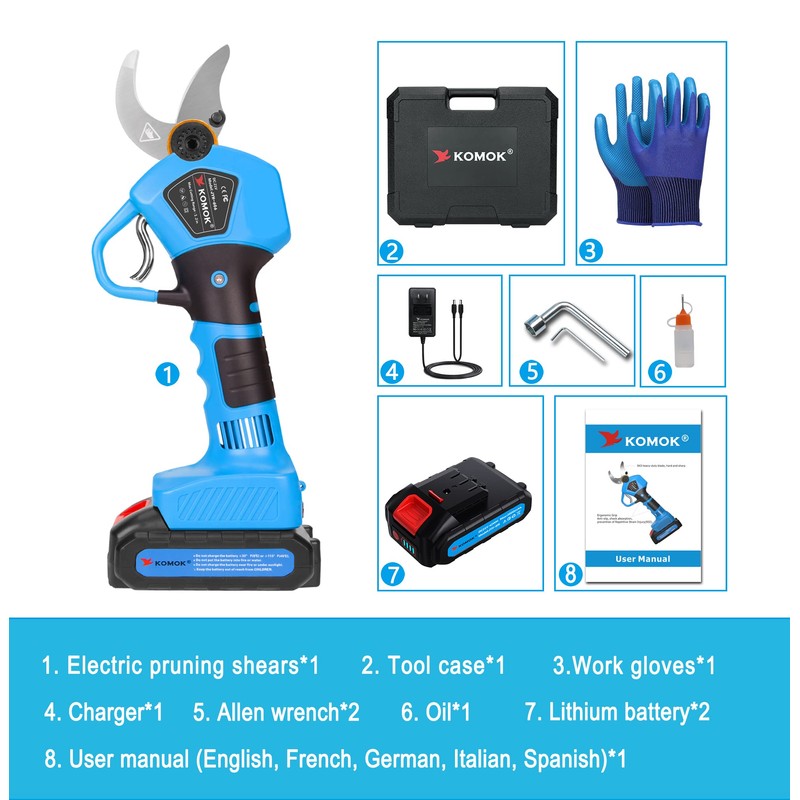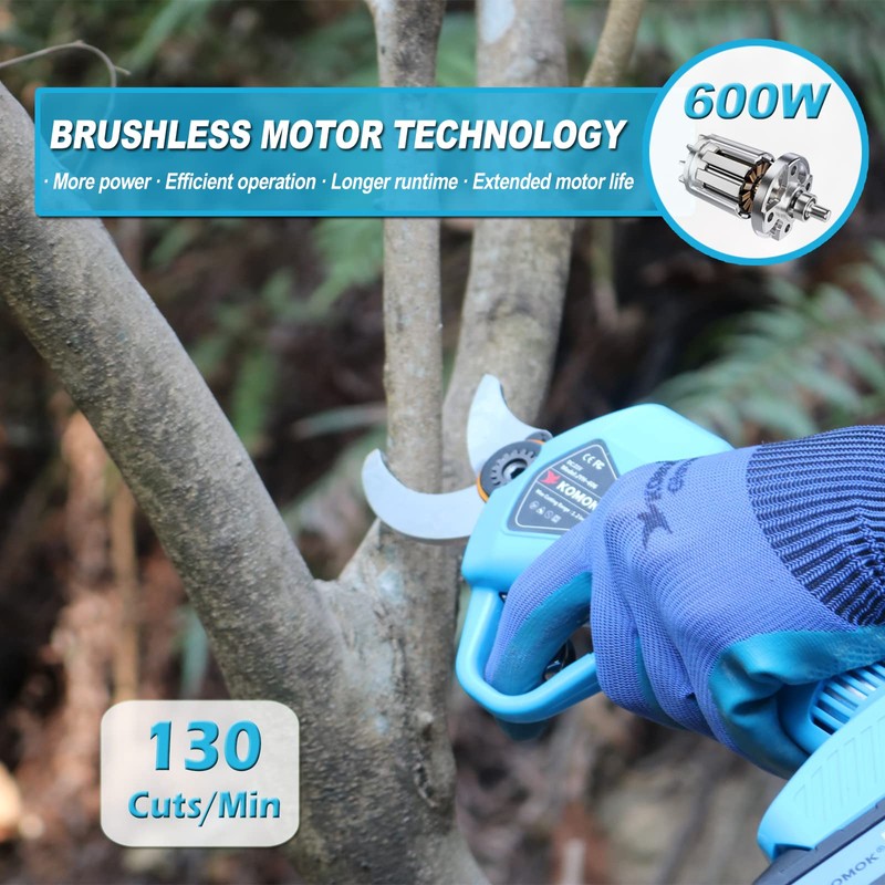 - [Very Sharp & Strong Power]--The KOMOK professional cordless pruning shears’ blade is forged from SK5 high carbon steel and powered by brushless motor. It is extremely sharp and durable, making it easy to cut 1.2 inch / 30mm hard branches.Also its service life is 3 to 5 times that of a conventional brush motor.