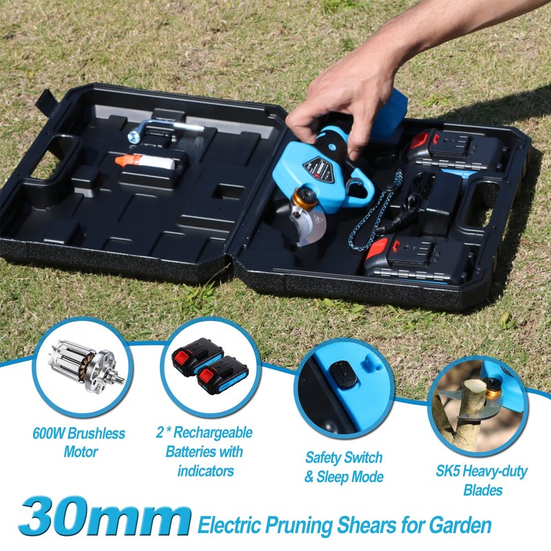 - 【Anywhere & Anytime Working】 -- Cordless pruning shears weigh about 2.2 lbs (body + 1 battery), its portable design enables users to operate it flexibly in different conditions. And, electric pruners has a wide range of uses, all kinds of gardens, parks, farms, large pastures, orchards, greenhouses, you can cut grape, cherry tree, apple tree, etc.