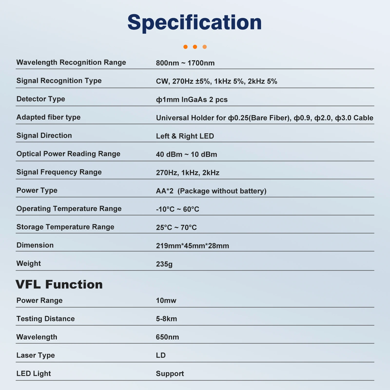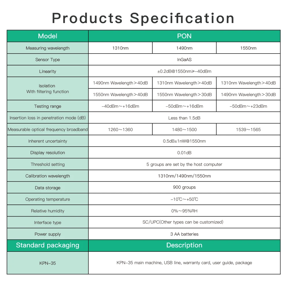 - Wavelength Range: KPN-35-A: -70~+6dBm KPN-35-C:-50~+26dBm