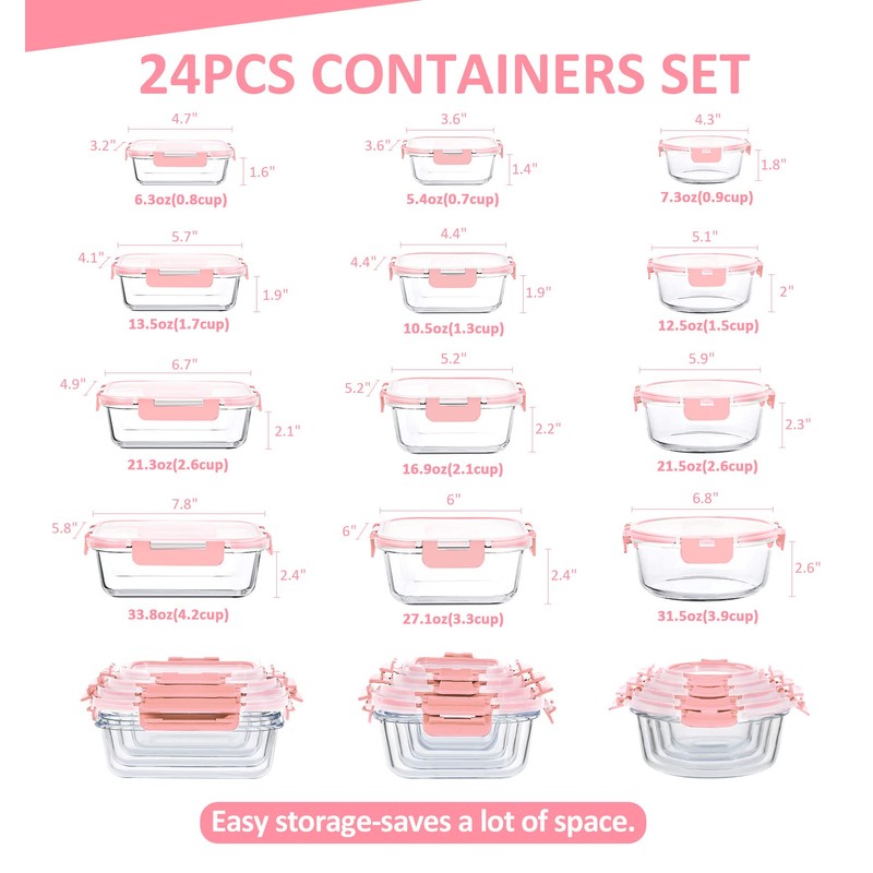 - GLASS CONTAINERS SET 24 PIECES: This set includes 12 glass meal prep containers with 12 lids in various sizes and shapes. Ideal for meal prep, office lunches, leftovers and portion control, bringing convenience to take meals to gym, picnic, travel, and more. Package includes: 1 (33.8 oz),1 (21.3oz ),1 (13.5oz ),1 (6.3 oz),1 (27.1 oz),1 (16.9 oz),1 (10.5 oz),1 (5.4 oz),1 (31.5 oz),1 (21.5oz ),1 (12.5oz ),1 (7.3 oz) glass storage containers with locking lids.