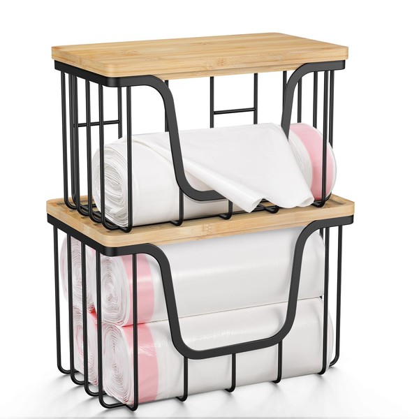 KONE Trash Bag Holder, 2 Pack Garbage Bag Dispenser, Storage Stackable Kitchen Organizer with Bamboo Top, Wall Mount Laundry Pantry Organization Black