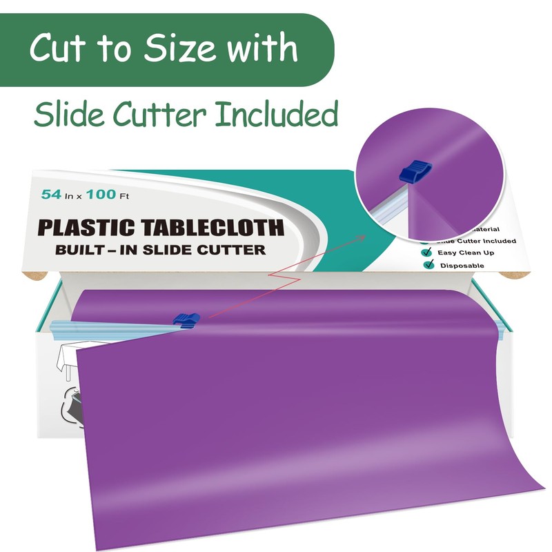 - Customize the Size to Fit the Table: 54 inch x 100 feet plastic tablecloth comes with a built-in cutter box which is convenient for you to cut out the tablecloth you want to fit the table size, and store the rest of the tablecloth in box for next time.