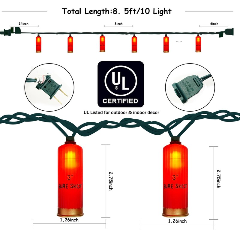 - Easy Installation and Extendable: With a length of 8.5 feet and a green wire, red shotgun shell Christmas light are easy to install and can be extended as needed to cover larger areas. Whether you're decorating indoors or outdoors, setting up red shotgun shell string light is a breeze, making them ideal for various occasions and celebrations.
