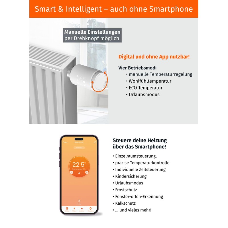 - ✔️ Easy to use – thanks to the clear display and rotary knob, simply operate the thermostat yourself or program via app from anywhere.