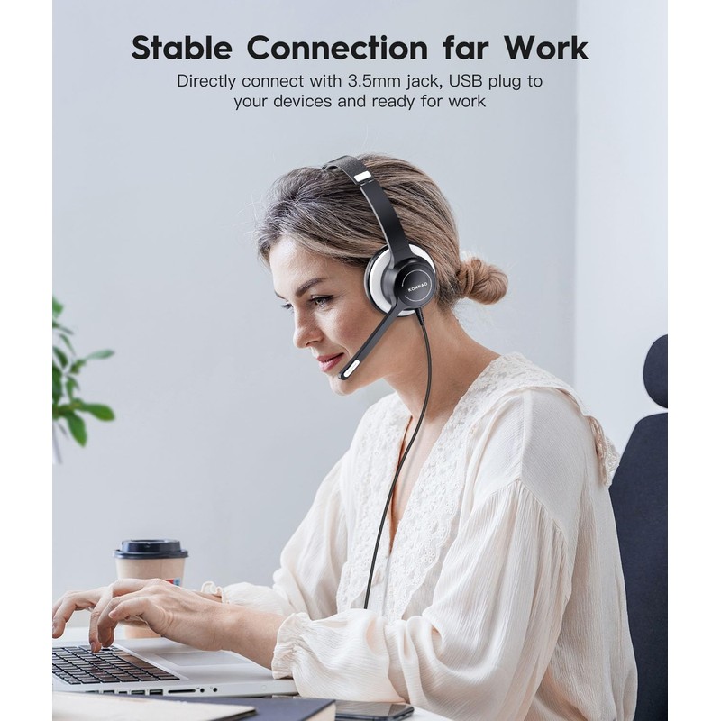 KONNAO Computer Headset with Microphone, 3.5mm/USB Headsets Wired with Noise Cancelling Microphone, Stereo Headphones with MIC for PC, in Line Controls, Work Headset for Skype Zoom Tablet Laptop