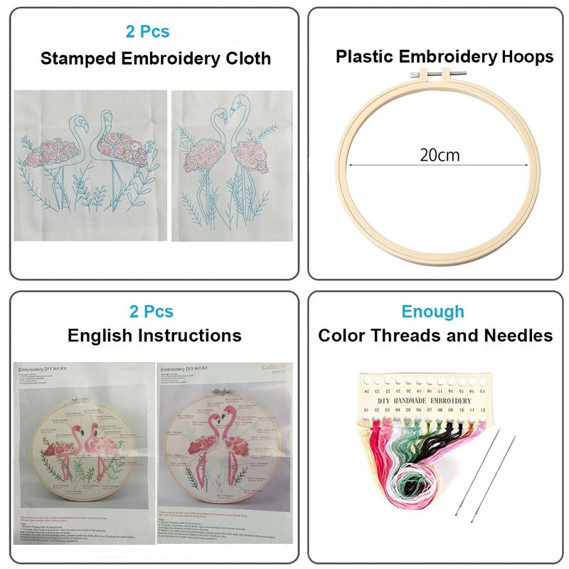 - 【Lieferumfang】: 2pc Kunststoff Stickreifen, 2pcs Sticktuch mit Flamingo Muster, Farbfäden, Sticknadeln, Anleitung.