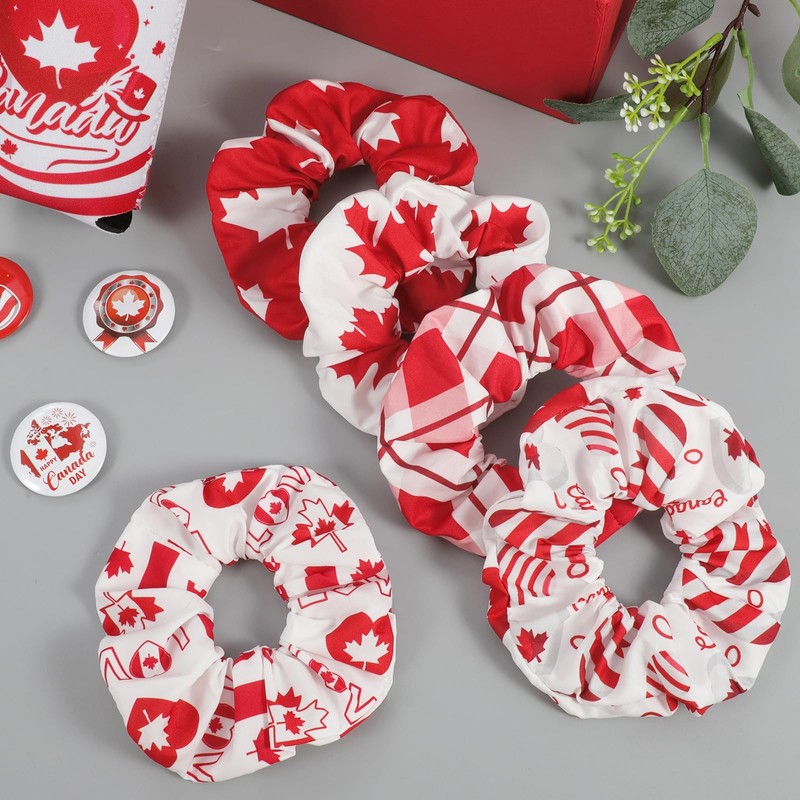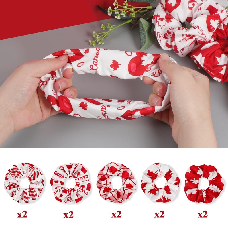 - Canada Scrunchies for Hair : You will receive 10 pcs Canada Day themed hair ties for girls in 5 styles, 2 of each style. These classic red and white color matching hair scrunchies include patriotic elements such as maple leaves, hearts, balloons, flags, OH Canada, Canada and more
