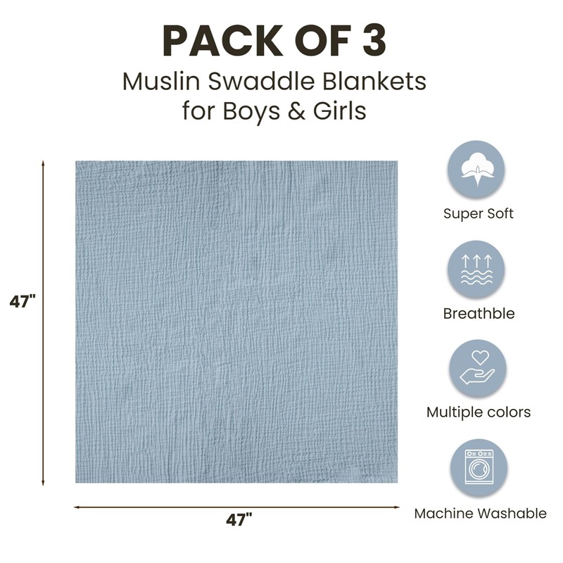 Konssy 3 Pack Muslin Swaddle Blankets for Unisex, Newborn Receiving Blanket, Large 47 x 47 inches, Soft Breathable Muslin Baby Swaddles for Boys & Girls