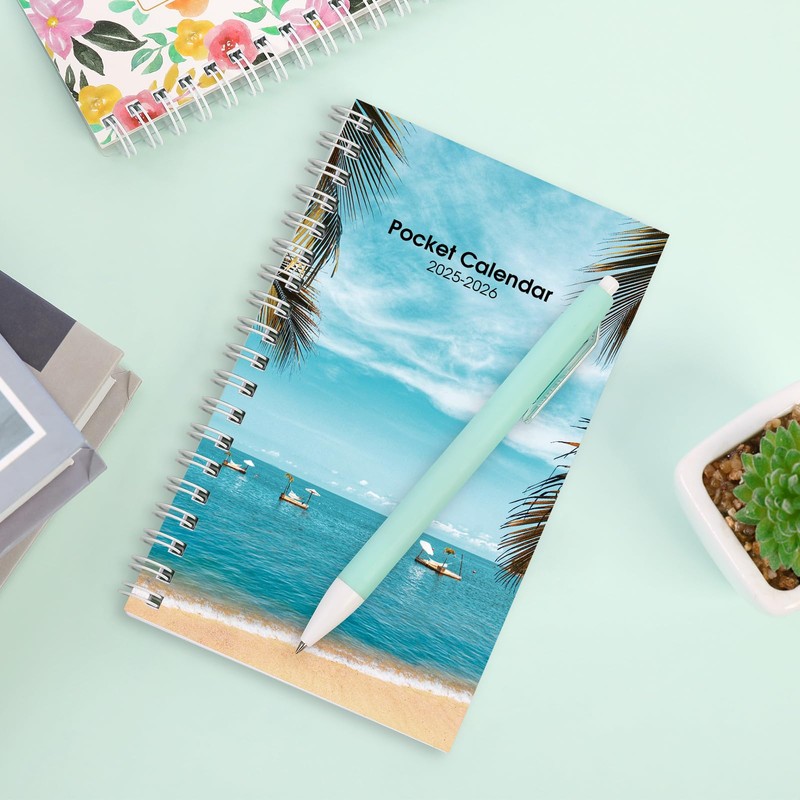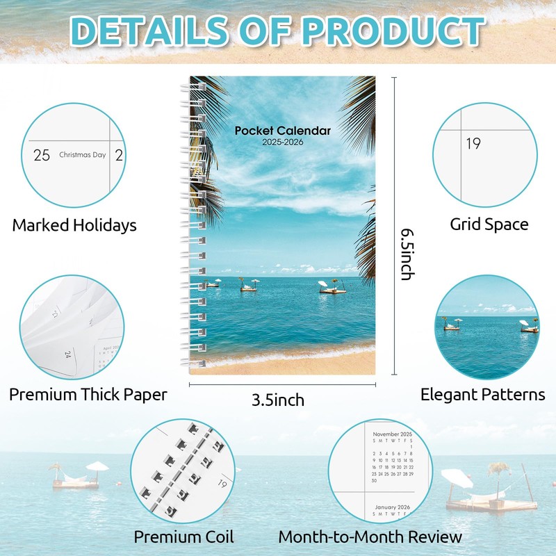 KONVINIT Pocket Calendar 2025-2026, Beach Pocket Calendar 2025-3.5” × 6.8” - Runs from January 2025 until December 2026, 2025 Monthly Planner with Coil Cover for Organizing