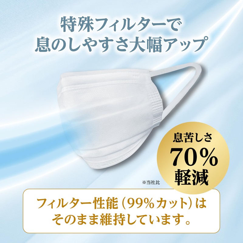 - 特殊フィルターで息苦しさ70%軽減させ、呼吸快適度大幅UP(当社比)