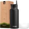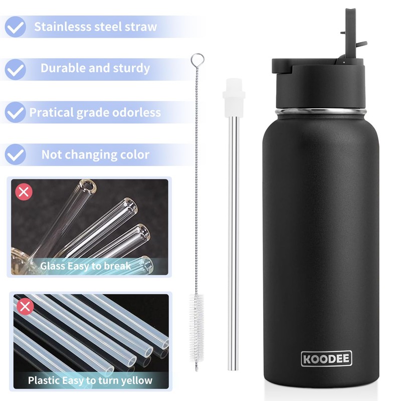 Koodee 32 oz Water Bottle with Wide Handle Straw Lid, Vacuum Insulated 18/8 Stainless Steel Wide Mouth Flask (Black)